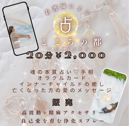 生年月日、手相からあなたの本質と活かすと良い才能をお伝えします。オラクルカードからはお悩みの現状、アドバイスや、今必要なメッセージなどを伝え、気づきへと導いていきます。自分について知ると周りの情報に流されにくくなったり自分の短所が好きになって、自分を大切にすることで周りも幸せになれる世界が広がっていきます。