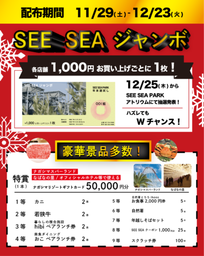 SEE SEA ジャンボ券は各店舗1,000円お買い上げごとに1枚進呈します。