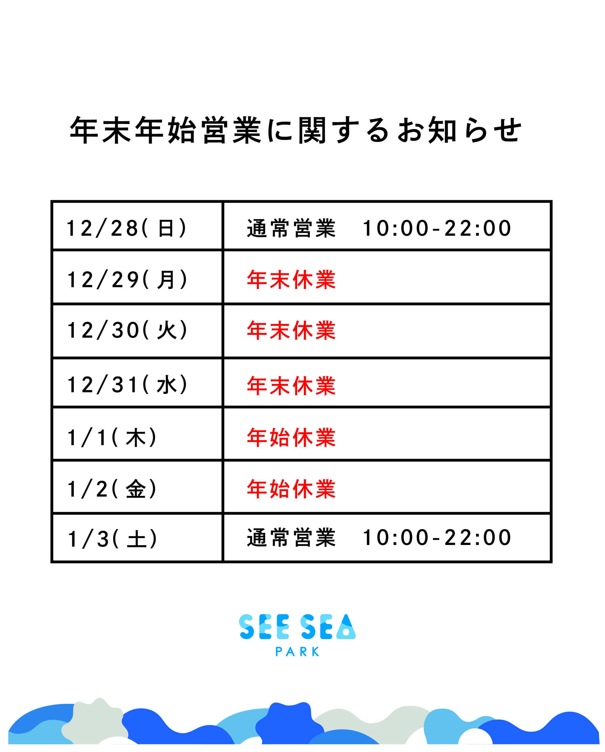 尚、SEE SEA PARKは、12/29(月)より年末年始のお休みをいただき、1/3(土)から2026年の営業を開始いたします。