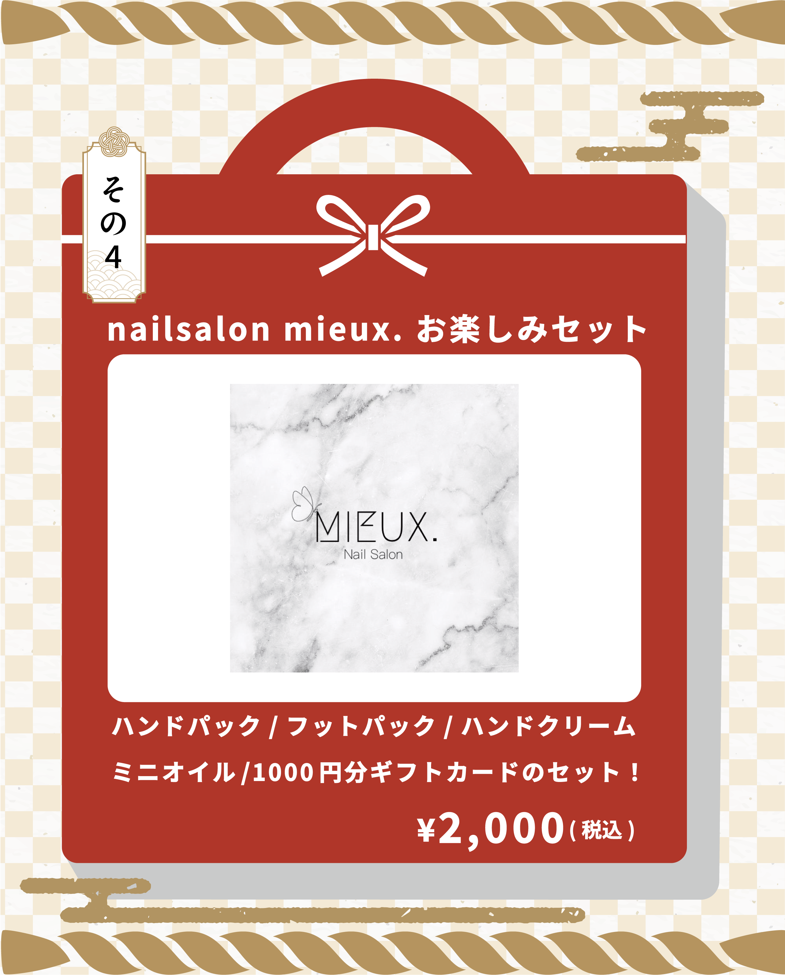各店舗の福袋を数量限定で販売します!ドリンクやランチ券、美容アイテム、焼き菓子セット、アパレルなどをご用意します。無くなり次第終了です。お早めにお買い求めください。